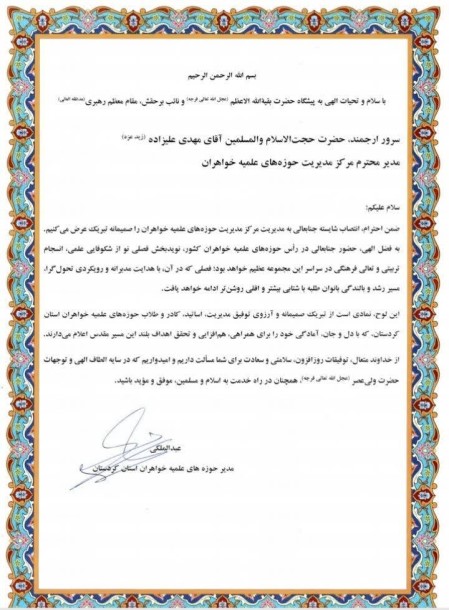 این لوح نمادی است از تبریک صمیمانه و آرزوی توفیق مدیریت اساتید کادر و طلاب حوزههای علمیه خواهران استان کردستان که با دل و جان آمادگی خود را برای همراهی همافزایی و تحقق اهداف بلند این مسیر مقدس اعلام میدارند.