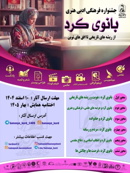 به گزارش پایگاه خبری و رسانهای حوزههای علمیه خواهران/ کردستان، جشنواره ملی فرهنگی، ادبی و هنری «بانوی کُرد؛ از ریشههای تاریخی تا افقهای نوین» با رویکردی به بازخوانی هویت، ویژگیها و دستاوردهای علمی، فرهنگی، اجتماعی و سیاسی بانوی کُرد در طول تاریخ و همچنین شناسایی مفاخر بانوان کُرد در عصر حاضر، برنامهریزی شده و با هدف افزایش آگاهی عمومی و تولید محتوای فاخر در حوزههای یاد شده، در بهار سال ۱۴۰۵ برگزار خواهد شد.